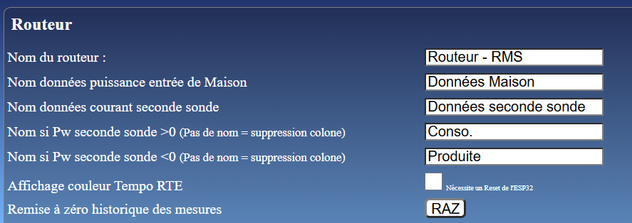 Un bouton RAZ permet d’effacer l’historique des données stockées dans la mémoire de l’ESP32.