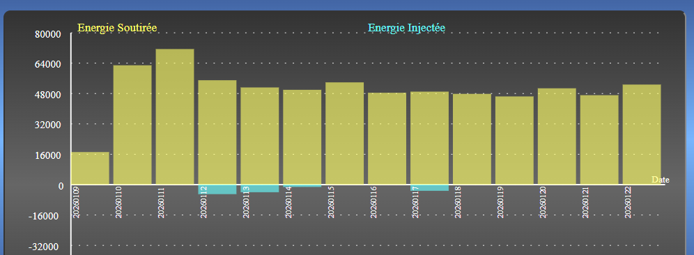 Plus bas sur la page, deux autres graphes donnent la puissance active sur 48H et l’énergie quotidienne (Soutirée-Injectée) en Wh sur un an. Ce dernier est stocké en mémoire ROM de l’ESP32 pour ne pas être perdu en cas de coupure de courant.