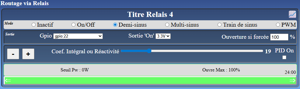 Pour chaque action, sur la page d’accueil du routeur vous avez le résultat du calcul de durée équivalente d’ouverture. Un Triac ou un SSR ouvert à 50% pendant 2h donne une équivalence de 1h à 100%.