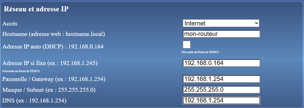 Il est possible d’obtenir une adresse IP (Internet) en automatique en cochant la case DHCP, ou ce qui est préférable, la fixer soi-même. Voir ici : https://f1atb.fr/fr/routeur-photovoltaique-installation-rapide-du-logiciel/