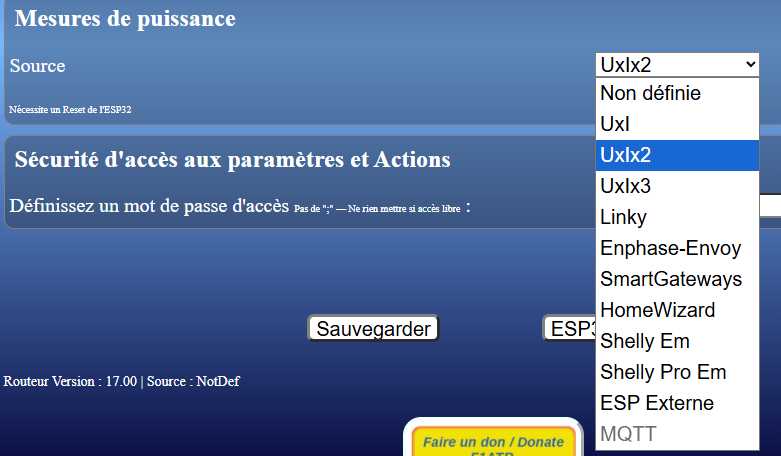 Il est primordial de définir la source des informations de puissance en entrée de maison : UxI, UxIx2, UxIx3, Linky, Enphase-Envoy, SmartGateways, Shelly Em, Shelly Pro Em, ESP Externe ou MQTT. Voir les pages dédiées aux différents capteurs pour plus d’informations.