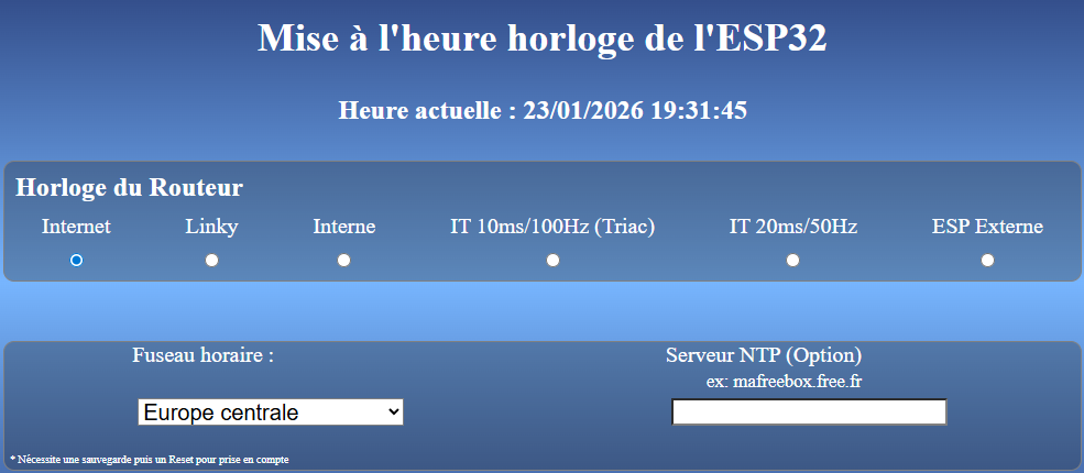 • il y a une horloge interne à l’ESP32 relativement précise. Une page spéciale permet la mise à l’heure,