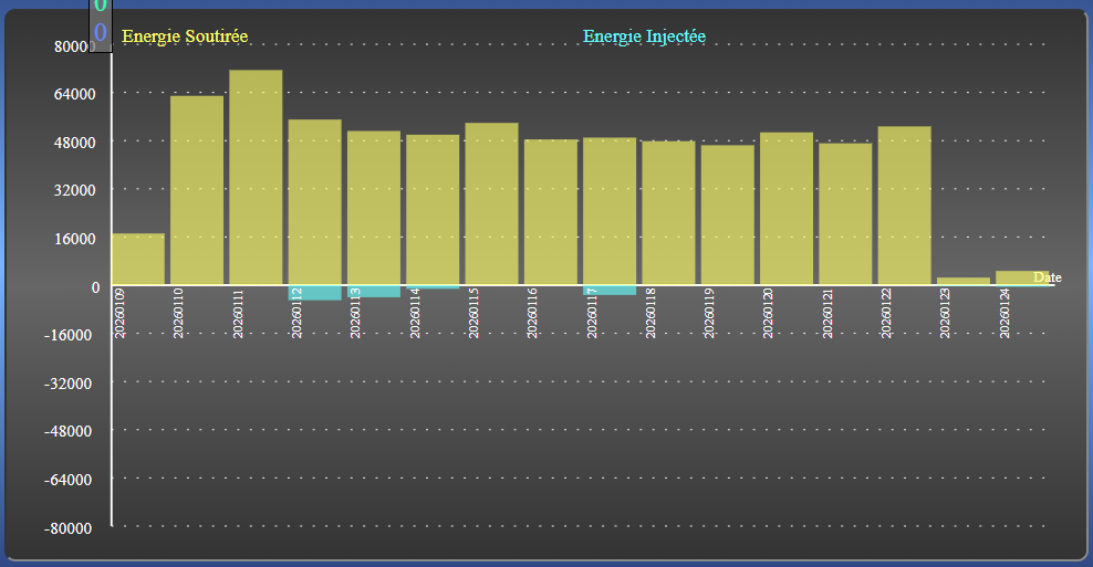 Plus bas sur la page, deux autres graphes donnent la puissance active sur 48H et l’énergie quotidienne (Soutirée-Injectée) en Wh sur un an. Ce dernier est stocké en mémoire ROM de l’ESP32 pour ne pas être perdu en cas de coupure de courant.